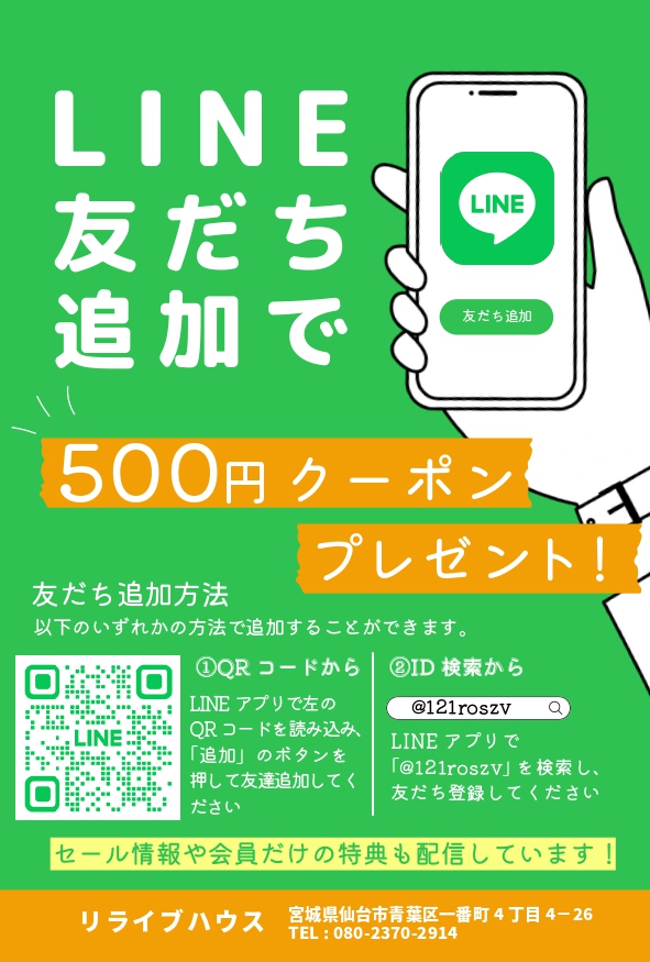 お買い物時に使える500円OFFクーポンをLINEで配信しています。